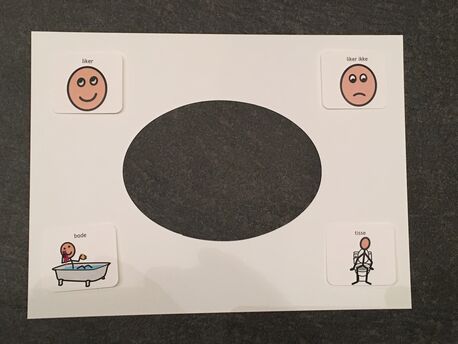 For å kunne se barnets øyne rett forfra når man lærer symboler, kan det være fint å kunne bruke en øyepeketavle. Da kan man lettest se hvor barnet ser. Dette er et plastark, likt det som er brukt til symbolkortene, med et ovalt hull i midten så du kan holde den opp og se barnets øyne i hullet. Fest plastkortene dine med symboler i hjørnene med lærertyggis, og lek og lær i vei!